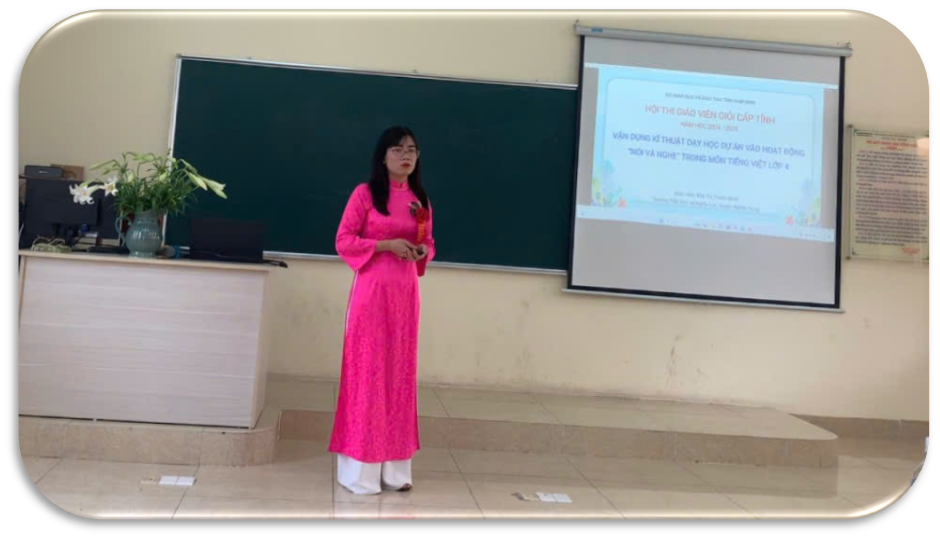 Ngoài phần thi thực hành tiết dạy, cô còn có phần trình bày biện pháp “Vận dụng kĩ thuật dạy học dự án vào hoạt động “nói và nghe” trong môn Tiếng Việt lớp 4”. Cô đã chia sẻ nhiều kinh nghiệm bổ ích, chẳng hạn như việc sử dụng phương pháp dạy học tích cực, lồng ghép trò chơi giáo dục vào bài giảng, ứng dụng công nghệ thông tin nhằm tăng tính trực quan và sinh động cho bài học. Đồng thời, cô cũng nhấn mạnh tầm quan trọng của việc rèn luyện kỹ năng quan sát, tư duy phản biện cho học sinh thông qua các hoạt động trải nghiệm thực tế.