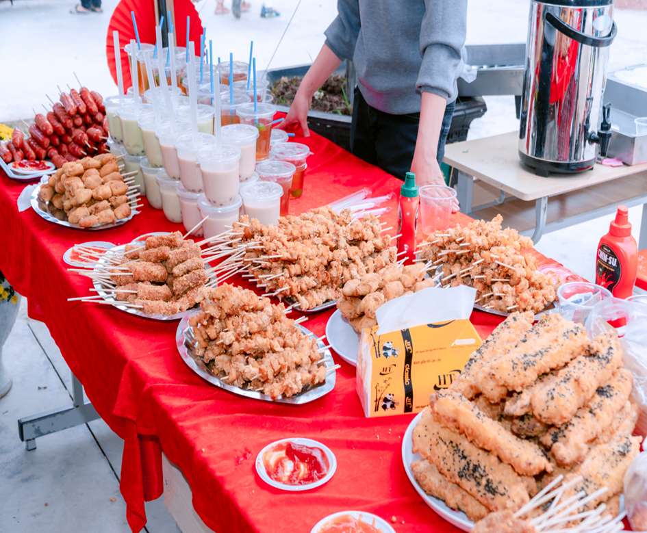 Bên cạnh các hoạt động văn nghệ, khu trò chơi dân gian và các gian hàng ẩm thực luôn thu hút sự quan tâm của đông đảo học sinh. Một trong những nội dung nổi bật của Hội chợ Tết là hoạt động mua sắm tại các gian hàng ẩm thực bằng phiếu tiền ảo. Trước khi tham gia hội chợ, mỗi học sinh được nhà trường phát một số lượng phiếu mua hàng với mệnh giá cụ thể. Các em sử dụng phiếu này để lựa chọn và mua các món ăn tại các gian hàng do giáo viên và học sinh cùng chuẩn bị, tạo nên không khí mua bán sôi nổi, vui tươi nhưng vẫn đảm bảo trật tự, an toàn.