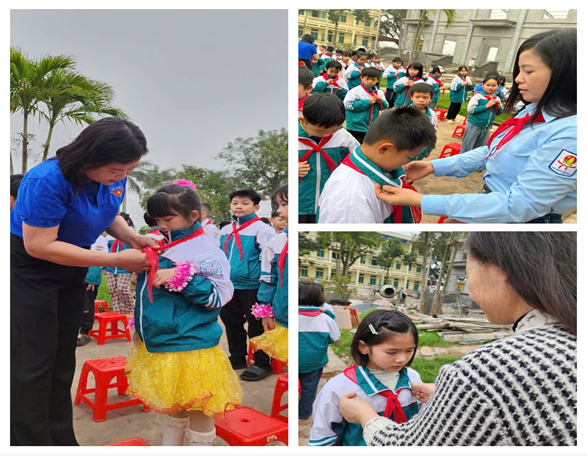 Những chiếc khăn quàng đỏ thắm được các thầy cô trong Ban giám hiệu, cô TPT Đội và các cô giáo chủ nhiệm trang trọng đeo cho từng đội viên mới trong niềm hân hoan, xen lẫn tự hào của của các bạn học sinh.