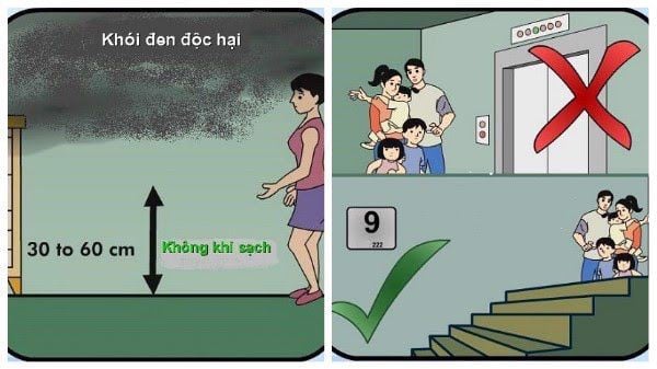 - Nếu có nhiều khói phát sinh thì hãy bò ở trên sàn nhà bởi vì khí sạch sẽ gần sàn nhà hơn. Lúc này hãy để cho mũi càng ở vị trí thấp càng tốt.