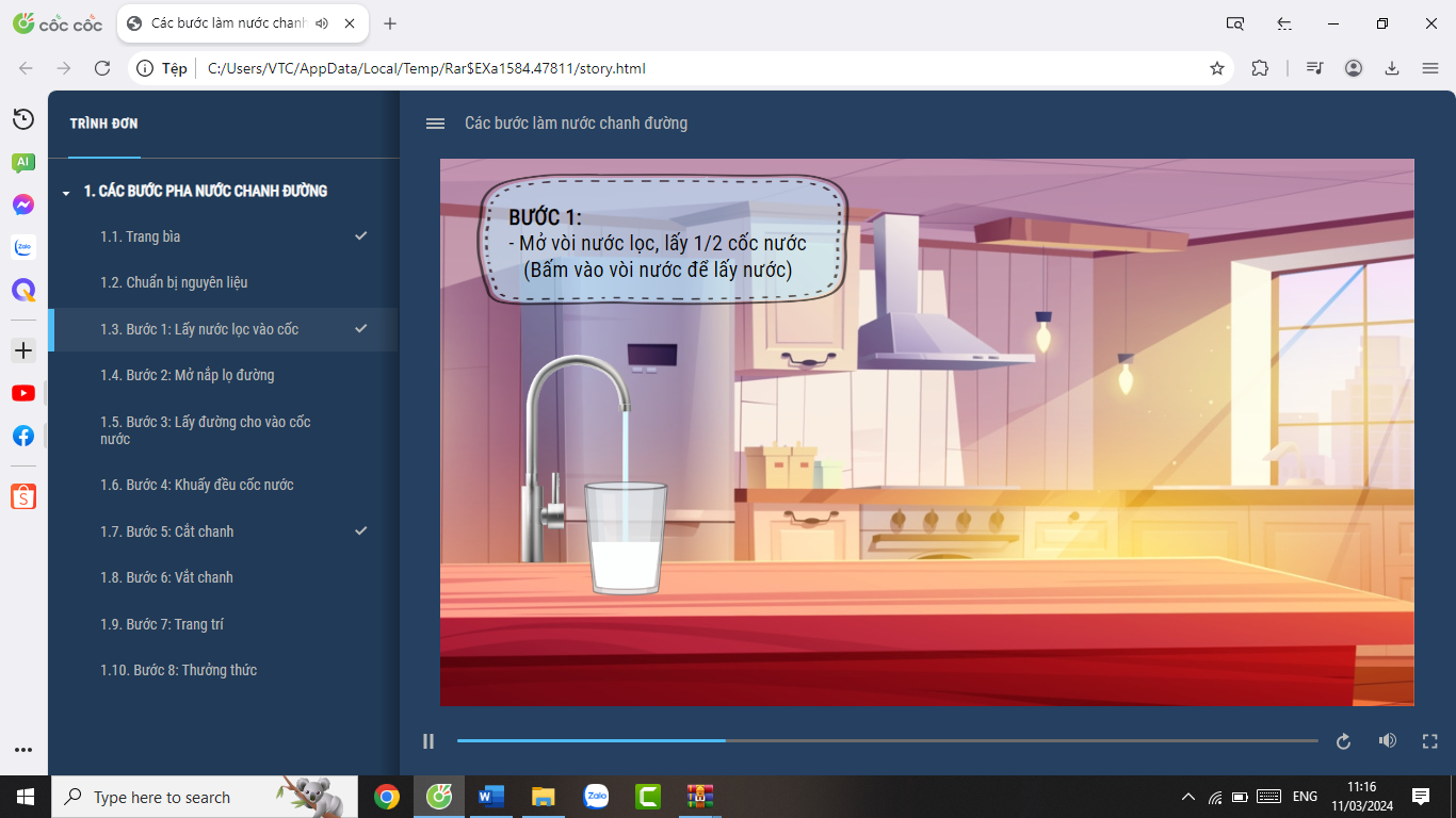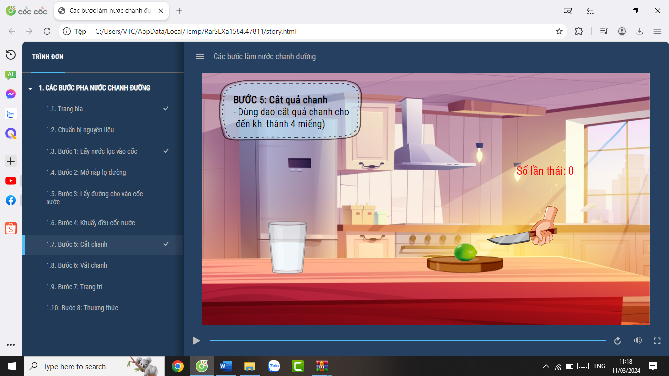 Bước 2: Thực hiện hoạt động tương tác trên các thiết bị mô phỏng quá trình pha nước chanh đường. Giáo viên yêu cầu các nhóm đọc thông tin, thực hiện đúng theo hướng dẫn.