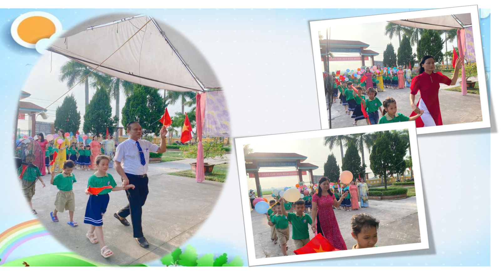 Sân trường tiểu học ngày khai trường rực rỡ sắc màu của cờ, của hoa, của nắng và của những nụ cười tươi thắm.