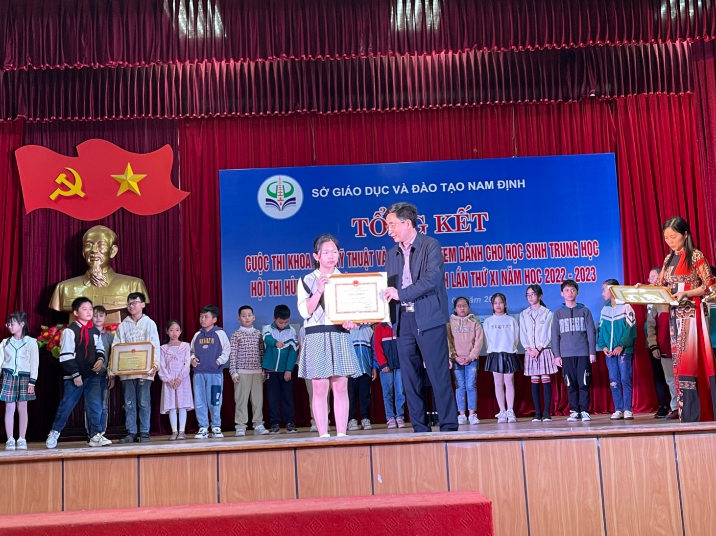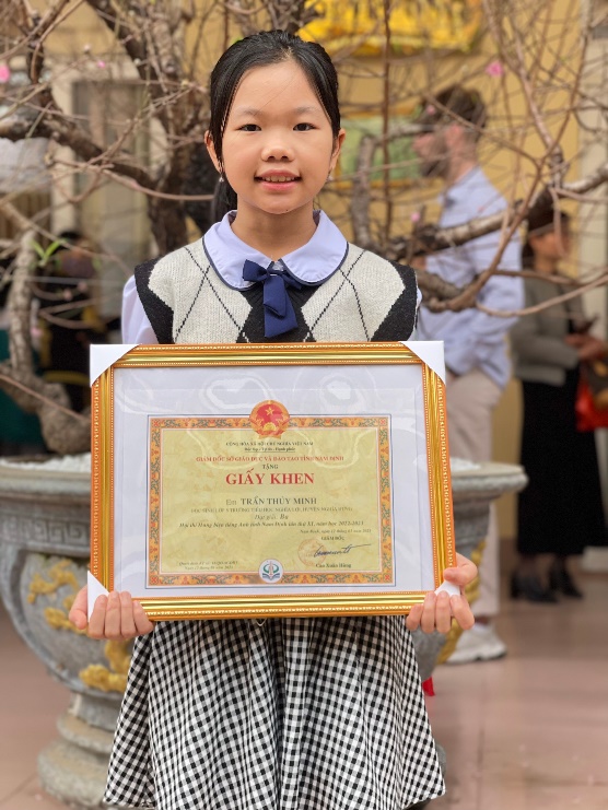 Sau 2 vòng thi sơ khảo và chung kết của cuộc thi “Hùng biện Tiếng Anh” do Phòng GD & ĐT huyện Nghĩa Hưng tổ chức, Thủy Minh đã gây bất ngờ cho ban giám khảo với phần thuyết trình về chủ đề “Thích học online hay học trực tiếp ở trường”.Với sự tự tin và câu trả lời thuyết phục em đã đạt giải Nhất của cuộc thi. Vượt qua vòng Sơ khảo cấp Tỉnh, em đã vinh dự lọt vào vòng Chung kết