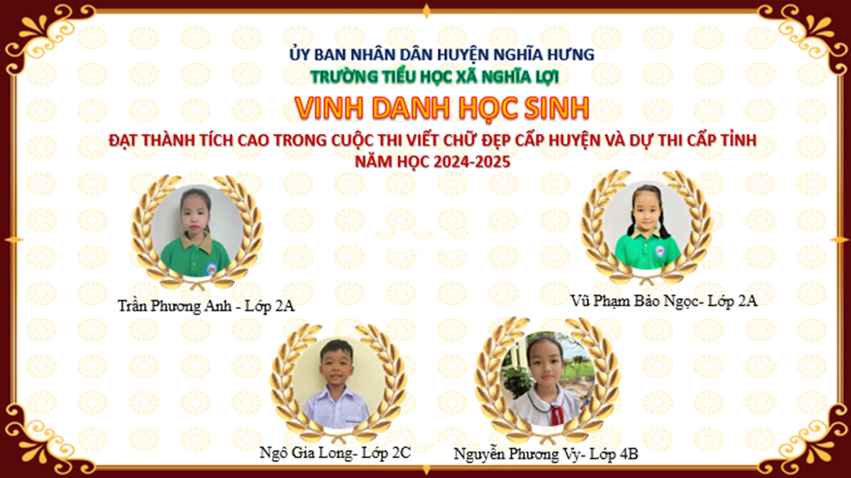 Rất vinh dự và tự hào cho nhà trường có 20 em dự thi cấp huyện thì cả 20 em đều đạt cao. Trong đó có 16 em đạt giải Chữ đẹp loại A và 4 em đạt giải A+ được dự thi cấp tỉnh đó là các em Trần Phương Anh lớp 2A, Vũ Phạm Bảo Ngọc lớp 2A, Ngô Gia Long lớp 2C và Nguyễn Phương Vy lớp 4B. Đây là minh chứng rõ nét cho tinh thần rèn luyện không ngừng của học sinh Nghĩa Lợi. Thầy cô và nhà trường luôn tự hào về các em.